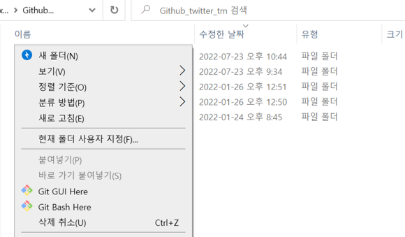 우선 이 폴더가 아니라 상위 폴더에 머무른 상태로,
