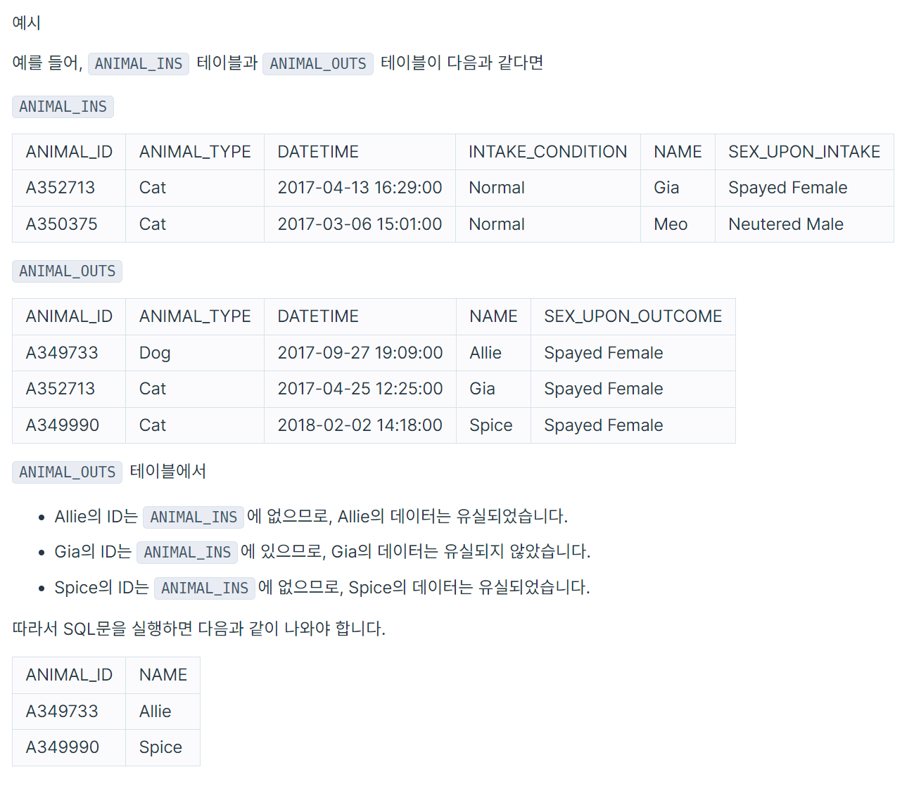 SQL SQL 프로그래머스: 없어진 기록 찾기 나는사라 2023. 5. 12. 13:43 풀이 TIP어떤 테이블 기준으로 JOIN 할지 생각한다.(OUTS엔 있어야 하지만, INS에는 없는 NAME)→ OUTS 테이블 기준으로, LEFT OUTER JOIN 해주자. + 그냥 FROM TABLE1, TABLE2의 경우 WHERE로 조인해도 된다. 그러나 JOIN 함수 사용할 경우 ON으로 조인해주자. 1) INNER JOIN 2) OUTER JOIN 참고 사이트: https://hongong.hanbit.co.kr/sql-%EA%B8%B0%EB%B3%B8-%EB%AC%B8%EB%B2%95-joininner-outer-cross-self-join/ 내 풀이 SELECT ANIMAL_OUTS.ANIMAL_ID, ANIMAL_OUTS.NAME FROM ANIMAL_OUTS LEFT OUTER JOIN ANIMAL_INS ON ANIMAL_OUTS.ANIMAL_ID = ANIMAL_INS.ANIMAL_ID WHERE ANIMAL_OUTS.NAME IS NOT NULL AND ANIMAL_INS.NAME IS NULL ORDER BY ANIMAL_ID 공유하기 게시글 관리 꼭 짱이 돼야지. 꼭 짱이 돼서 데이터를 분석으로 패버릴 거야. 저작자표시 (새창열림) 'SQL' 카테고리의 다른 글 SQL 빠른 요약 (0) 2023.05.12 SQL 프로그래머스: 상품을 구매한 회원 비율 구하기 (0) 2023.05.12 SQL 프로그래머스: 동명 동물 수 찾기 (0) 2023.05.12 SQL 프로그래머스: 자동차 대여 가능 여부 구분하기 (0) 2023.05.12 'SQL' Related Articles SQL 빠른 요약 SQL 프로그래머스: 상품을 구매한 회원 비율 구하기 SQL 프로그래머스: 동명 동물 수 찾기 SQL 프로그래머스: 자동차 대여 가능 여부 구분하기