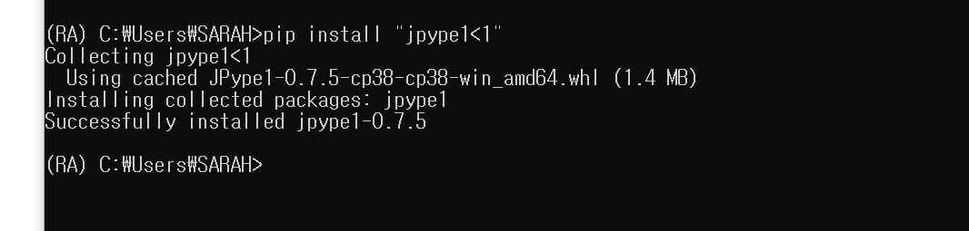 -내 코드: pip install C:\Users\SARAH\Downloads\JPype1-1.3.0-cp38-cp38-win_amd64.whl